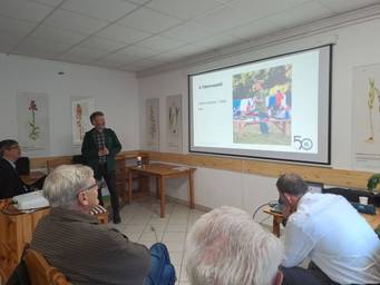 Délben a jóízű hidegtálas ebéd közben jóízű beszélgetések alakultak ki, Varga Gyöngyi jóvoltából még egy hatalmas Helyi Csoport Torta is felvágásra került. A csoki-narancs ízvilág jó választásnak bizonyult, többen repetát kértek, így majd fél óra késéssel tudtuk csak folytatni a programot. Emléklapokat adtunk alapítóinknak, kiemelt vendégeinknek, legaktívabb tagjainknak, akik segítsége nélkül Csoportunk talán már nem is létezne. Előadásában Selmeczi Kovács Ádám, a DINPI igazgatója a két szervezet kapcsolatát emelte ki, rámutatva további lehetséges kapcsolódási pontokra a jövőben. Végül Haraszthy László az elmúlt 50 év madártani változásairól tartott lebilincselő előadást, kiemelve nem csak a problémákat, de a sikereket is.